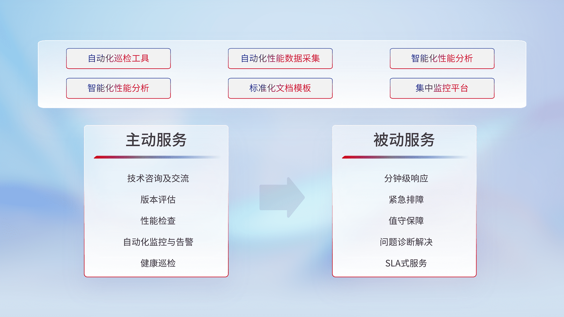智能化工具和标准化文档,,保障服务质量,,提供主动服务(包含技术咨询、、版本评估、、性能检查、、自动化监控与告警、、、、健康巡检)和被动服务包含(分钟级响应、、、紧急排障、、值守保障、、问题诊断解决、、SLA服务)。。