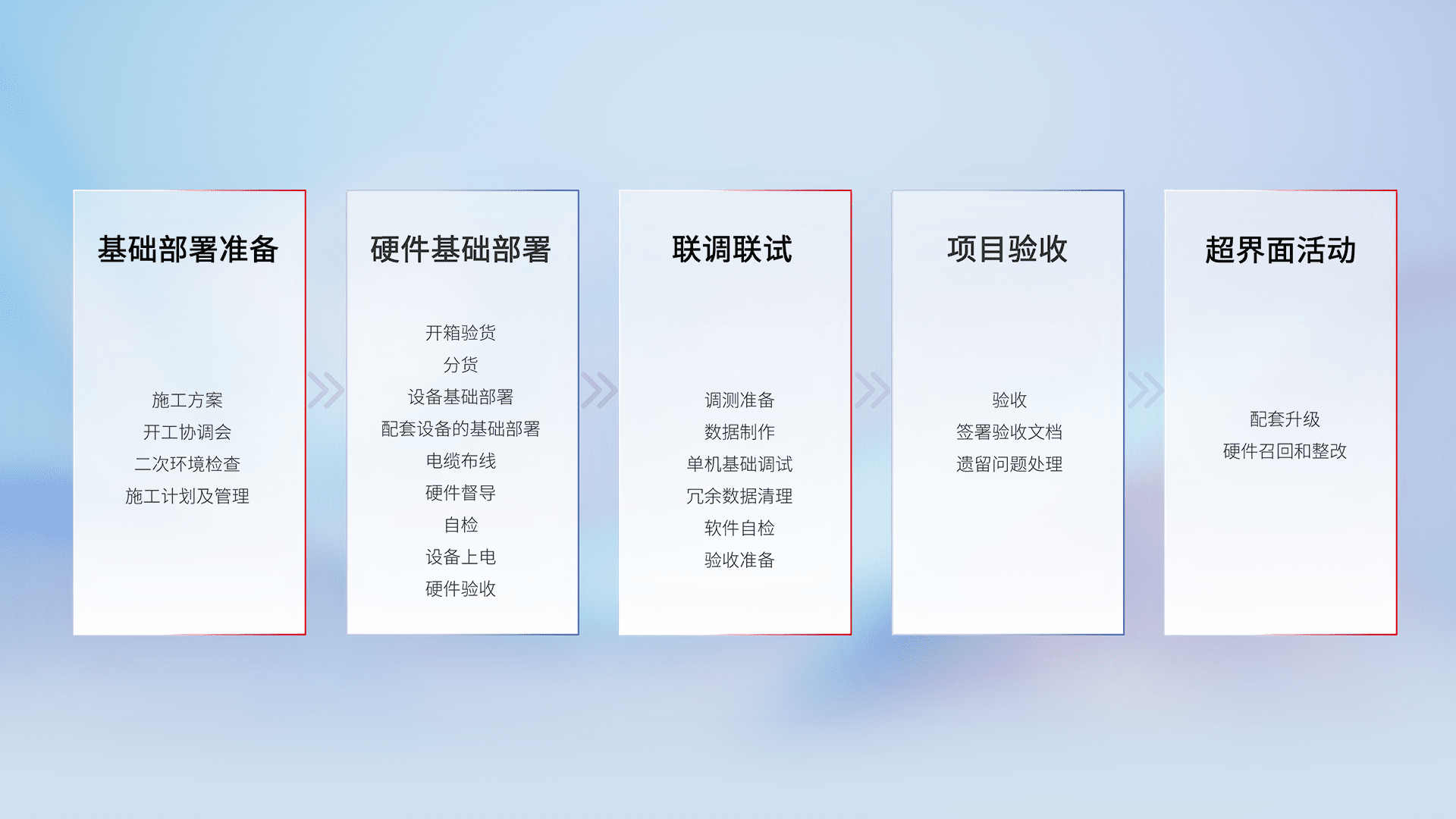 从基础部署准备、、、、硬件基础部署、、、、联调联试、、项目验收、、、越界面活动的全过程可追溯,,,保证施工质量和进度。。。。